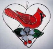 Made from real stained glass by highly skilled craftsmen. The glass pieces are layered when soldered together, which gives it a 3-dimensional effect. This large cardinal suncatcher is attached to a thick wire heart ring. The entire piece is plated with a silver finish for everlasting beauty. Approximately 8 inches x 8 inches
