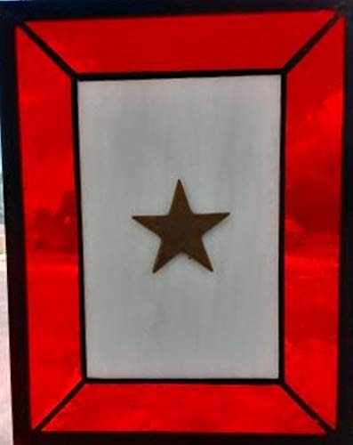Gold Star Edition of stained glass Serviceman’s Flag. The Gold Star is actually painted with a gold metalic paint. Approx 6 inches wide and 9 inches tall with chain for hanging.