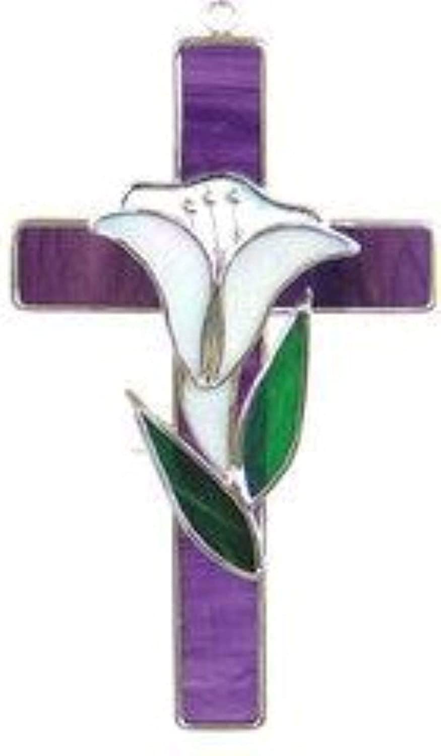 Purple Cross with Lily Made from Real Stained Glass and Plated with a Silver Finish