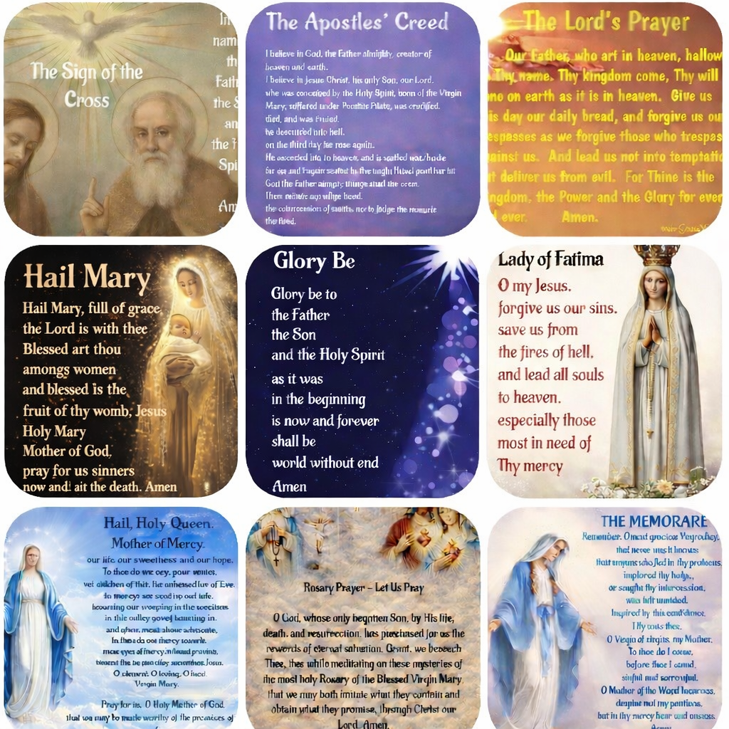 Bring the prayers of the Holy Rosary into your home with this beautifully designed Rosary Prayers Magnet Set from SassyXpressions. Each flexible magnet measures 5.5 x 4.25 inches and features a cherished Catholic prayer with inspirational artwork and clear, easy-to-read text.