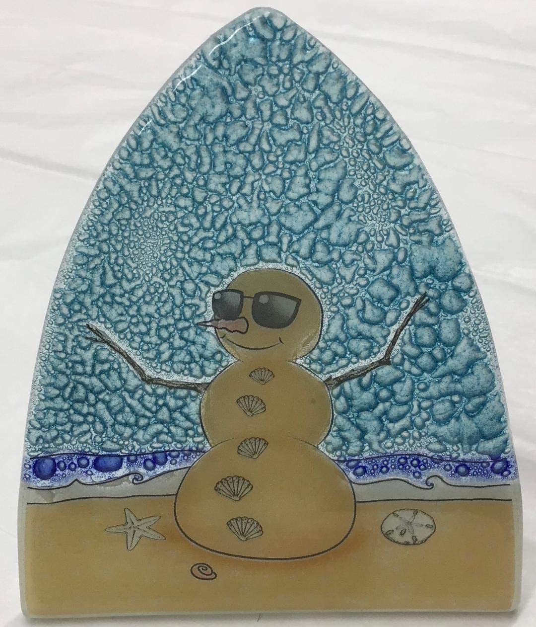 Snowman Sandman on Beach with Shell Button and Sunglasses Art Glass Night Light